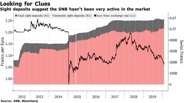 有关干预的官方统计数据每年只发布一次,但每周的即期存款(商业银行在瑞士央行存放的现金)数据可以提供一些线索。