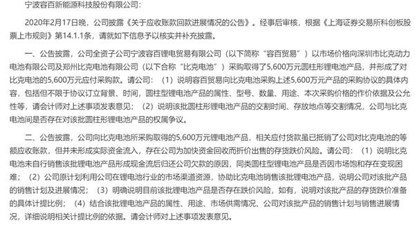 2月17日,一直被大额坏账困扰的容百科技发布公告,此前比克电池一直拖欠公司的应收款减少了5600万元。伴随公告而来的,则是监管部门的问询函。
