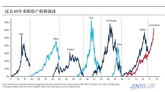 另外,由亚马逊、奈飞、谷歌、推特、EBAY、脸书组成的“电子商务(e-Commerce)”泡沫从2009年金融危机时的低点上涨超过1000%,现在它已经成为有史以来最大的资产泡沫。