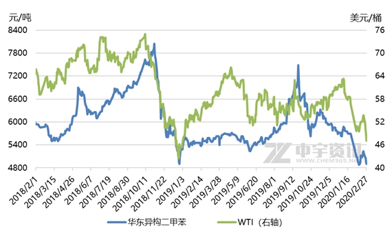2月末,江苏异构二甲苯市场价格4900元/吨较春节前5700元/吨,累计下跌800元/吨及14%。武汉封城,全国的医疗救援队奔赴武汉全力以赴“众志成城抗击疫情”,全国人们一起拧成一股绳,劲往一处使,在家不出门为抗击疫情做贡献。2月中上旬贸易商多数在家办公,下游一再延期复工,物流直至2月下旬后才集中恢复。2月的国内芳烃市场面对前所未有的挑战。