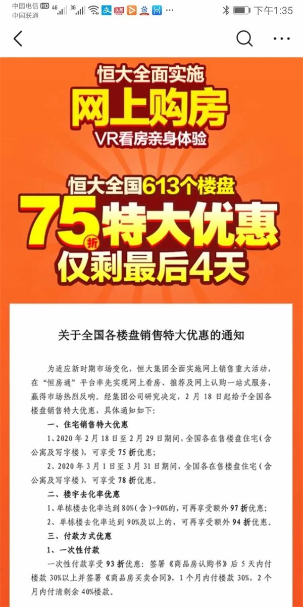 目前,恒大全国613个楼盘75折促销活动仍在如火如荼地进行。
