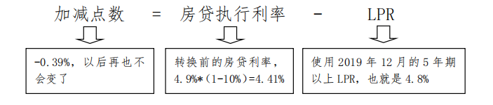 如果小王选择将这笔房贷的定价基准转换为LPR,现在5年期贷款基准利率是4.9%,转换前的实际执行利率就是4.9×(1-10%)=4.41%。2019年12月发布的5年期以上LPR为4.8%。根据转换时点利率保持不变的原则,小王这笔房贷的加减点数就是-0.39%=4.41%-4.8%,即减39个基点。