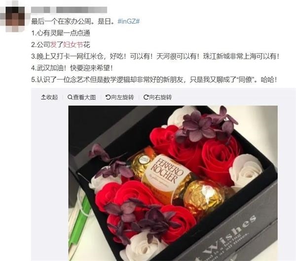 在晒妇女节福利的网友中,有的人收到200元购物券,有的收到400元现金,还有人收到的是巧克力和鲜花。疫情当下,这名收到鲜花的网友不忘为疫区送去祝福,在微博中写道:“武汉加油!快要迎来希望!”