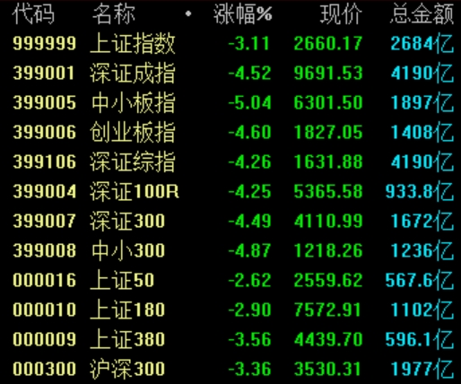 上周五(3月20日),美国股市三大股指大跌超3%,道琼斯指数更是急挫近5%。今日,上证综指、深证成指、中小板指、创业板指和沪深300指数跌幅均超3%。