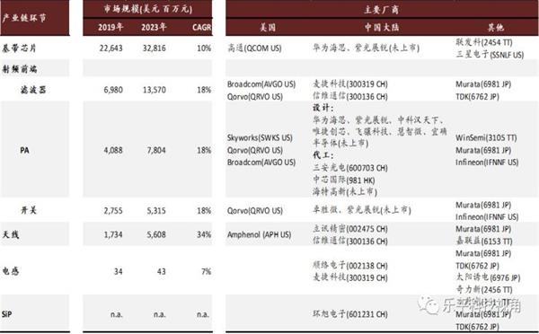 国金证券研报认为,预计今年下半年大量品牌将推出5G手机,而苹果2020年新机有望全部支持5G,研判随着5G手机的成本下降,2020年5G手机有望放量,带动新的换机潮。从4G到5G天线是绝对的增长,频率提升和频段增加,将代来天线数量和价值量的提升;随着天线数量的增加,手机射频连接通道数同步增加,传统的同轴连接线可能会被多层的MPI或LCP替代;射频前端价值量有望大幅增加,目前射频开关在4G手机单机价值量约为0.2-0.3美元,5G手机有望量价齐升、数倍增长。
