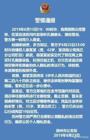 2019年6月,郑州市公安局发布警情通报,2019年6月15日19时许,郑州公安局接群众报警称,在某酒店房间内发现针孔摄像头,接报警后,警方第一时间介入调查。