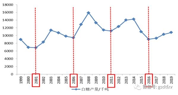 内糖方面,我国自产糖产量波动是典型的6年一个周期,从周期的角度看,2016年以来我国自产糖已连增三年,2019年将出现拐点,19/20榨季正式进入减产周期。(见图三)