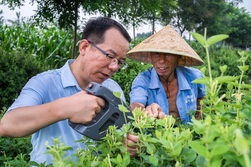 图为赵棣华在巨鹿县大留庄调研金银花采摘情况。 本报记者 刘志良 摄