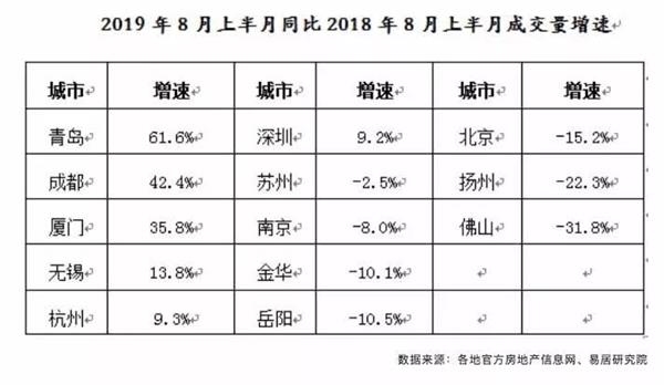 易居研究院最新的研究数据也表明,在其监测的13个城市中(一线北京、广州、深圳;二线成都、杭州、南京等;三四线岳阳、金华、扬州、佛山等),8月上半月成交量增速方面,佛山、扬州、岳阳、金华等三四线城市,增速下滑十分明显。