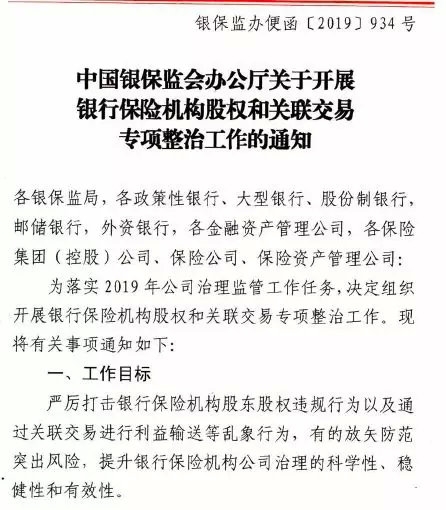 券商中国记者获悉,中国银保监会近日下发《中国银保监会办公厅关于开展银行保险机构股权和关联交易专项整治工作的通知》(下称《通知》),针对银行保险机构股权和关联交易进行专项整治,严厉打击股东股权违规行为以及通过关联交易进行利益输送等乱象行为。