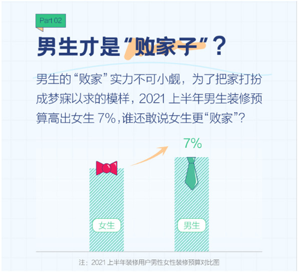 另外,为了把家打扮成梦寐以求的模样,男生的“败家”实力不可小觑。数据显示,2021上半年互联网装修用户中,男性人均装修预算比女性高约7%。