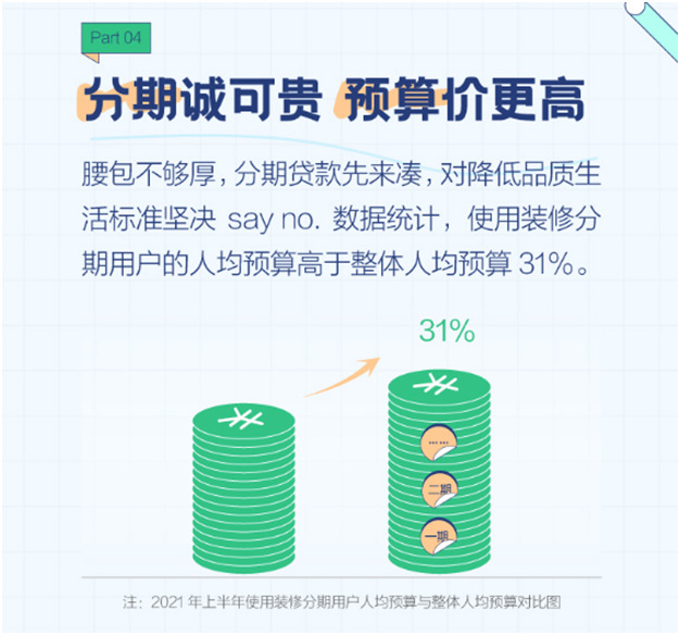 装修方面,选择贷款来解燃眉之急成为了用户选择装修分期贷的重要原因之一。报告显示,2020年至2021上半年的互联网装修用户中,使用装修分期贷人数环比增长约16%。值得一提的是,互联网装修用户中使用装修分期贷的用户人均预算高于整体人均预算约31%。