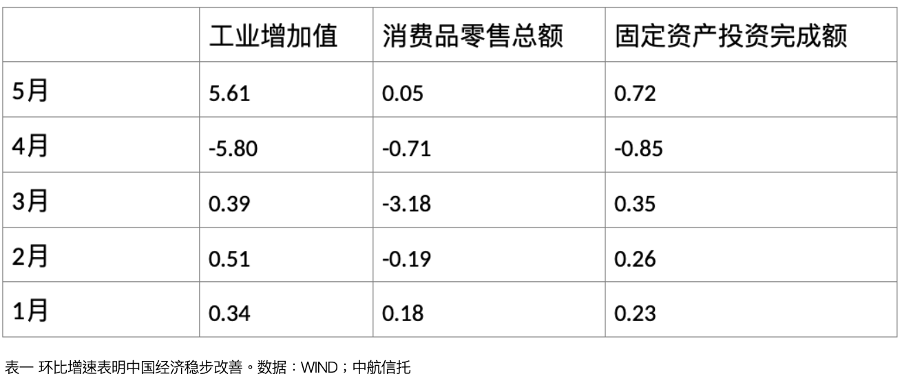 数据显示,4月份疫情对宏观经济的冲击最严重,5月份经济开始改善。总体看,生产环节率先复工,5月工业增加值环比(季调)增长5.61%;投资恢复节奏居中,5月环比增长0.72%;消费复苏相对缓慢,5月社会消费品零售总额环比小幅正增长。