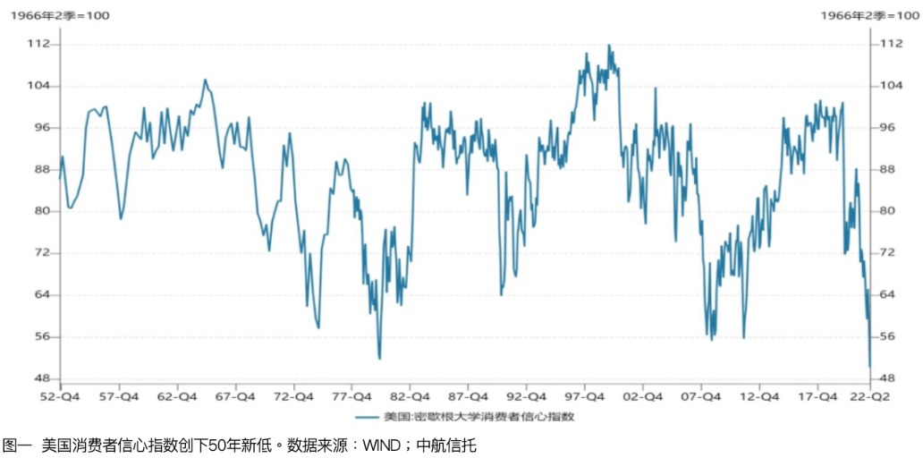和国内经济复苏不同,美国经济从年初开始下滑,到二季度下滑速度加快,各个领先指标都显示美国经济下半年将会陷入深度衰退。图一显示,美国密歇根大学消费者信心指数创下50年新低,而过去50年里,该指数每次低于70都是美国经济处于深度萧条状态,比如1970~1980年间、2008~2009年间该指数都非常低迷,事实上美国经济当时也是深度衰退。
