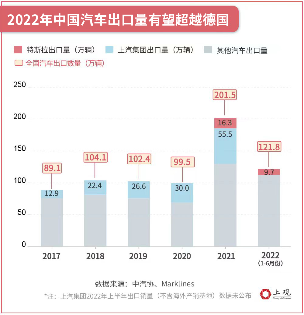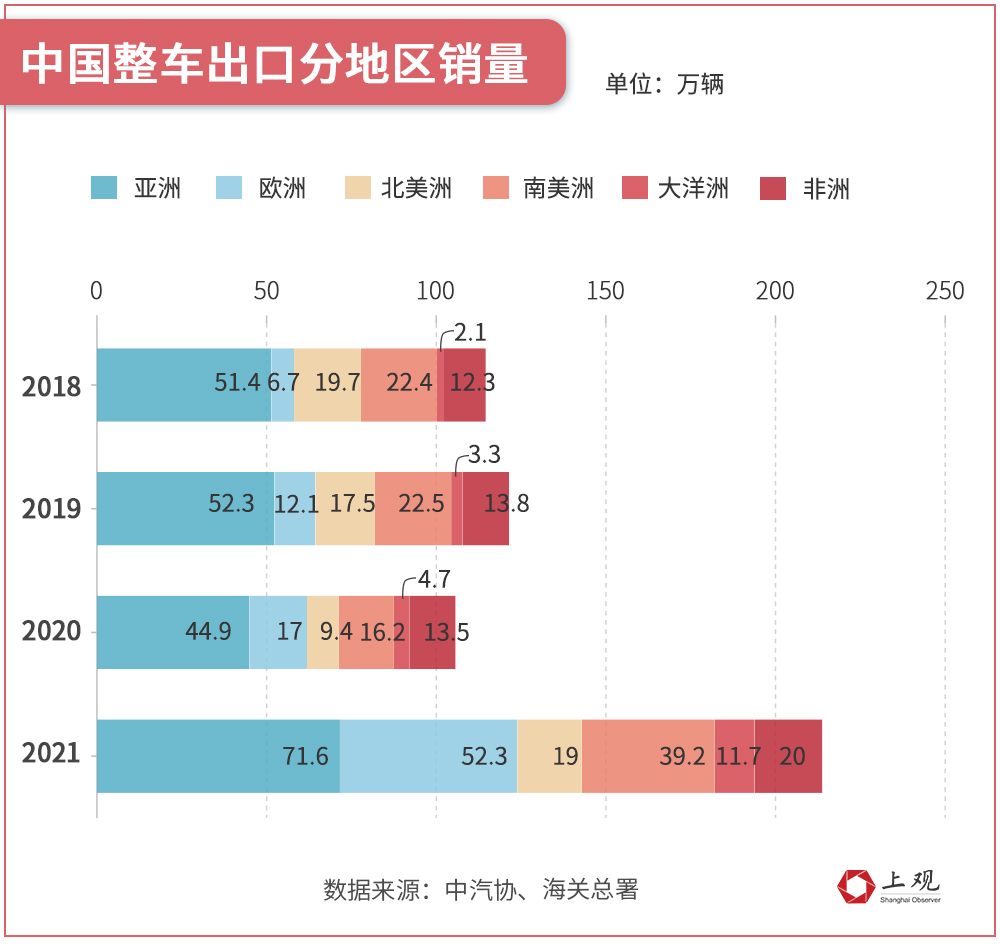 如果说个人感受不足以描摹全貌,统计数据则更能说明问题。2021年中国汽车出口201.5万辆,同比翻了一番。其中,增长最快的出口市场是欧洲,销量为上一年的300%。中国已成为继日本、德国之后的全球第三大出口国。