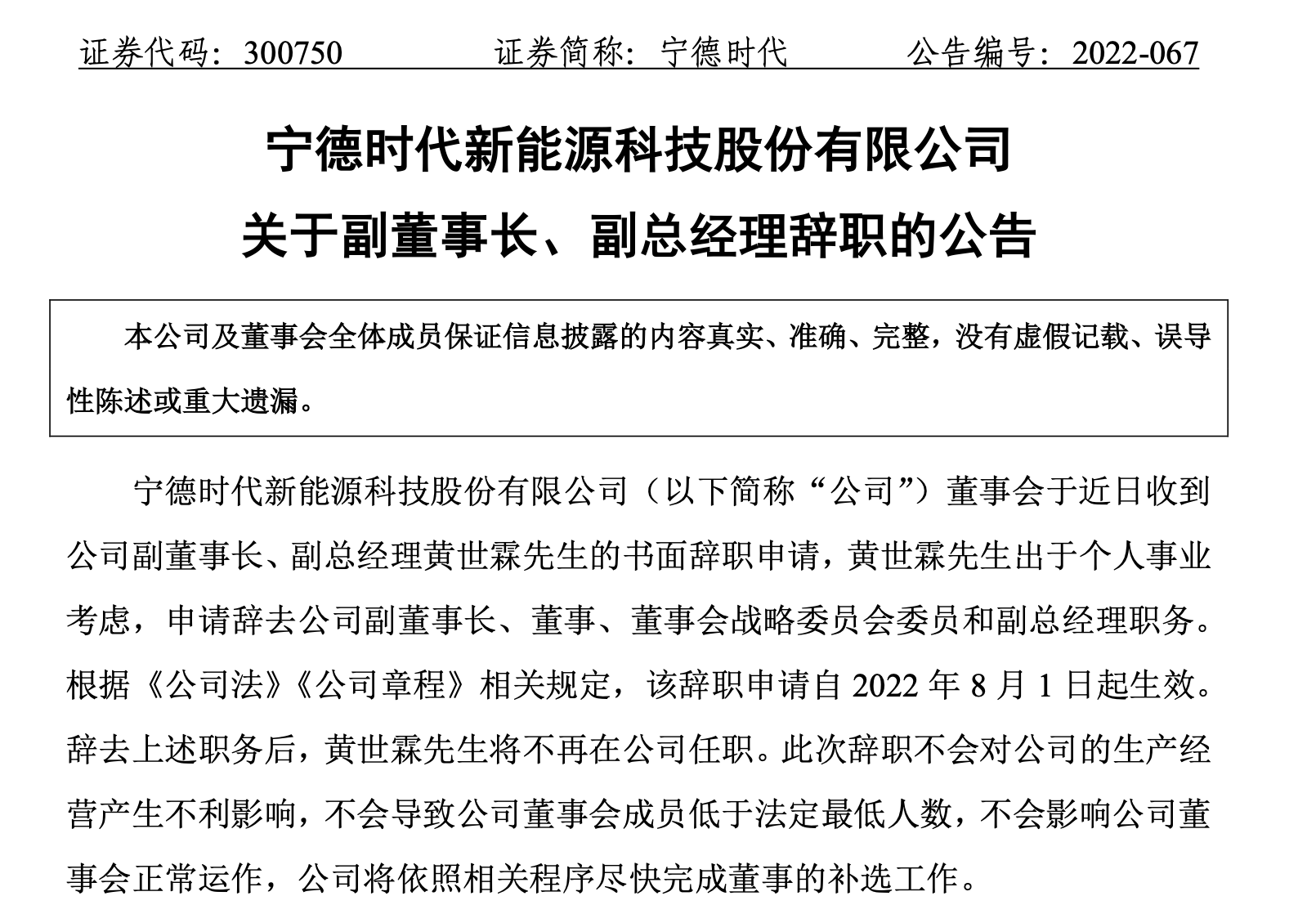 8月1日晚间,宁德时代发布高层人事变动系列公告,其中公司副董事长、副总经理黄世霖出于个人事业考虑,辞去公司副董事长、董事、董事会战略委员会委员和副总经理职务,辞职自8月1日生效。辞去上述职务后,黄世霖将不再在宁德时代任职。