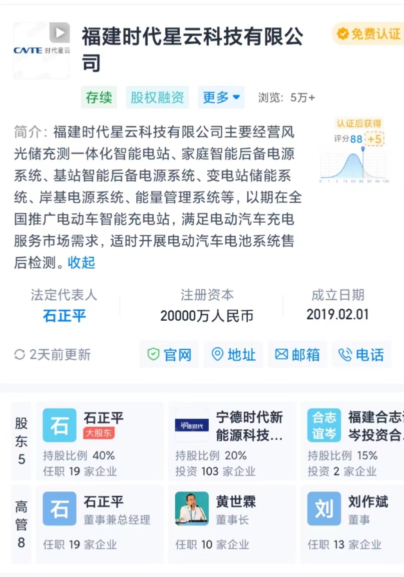 记者查询到,宁德时代曾在2019年初与星云股份合资成立了福建时代星云科技有限公司(下称“时代星云”),合资公司核心业务正是光储充检,而且黄世霖在时代星云任董事长一职。