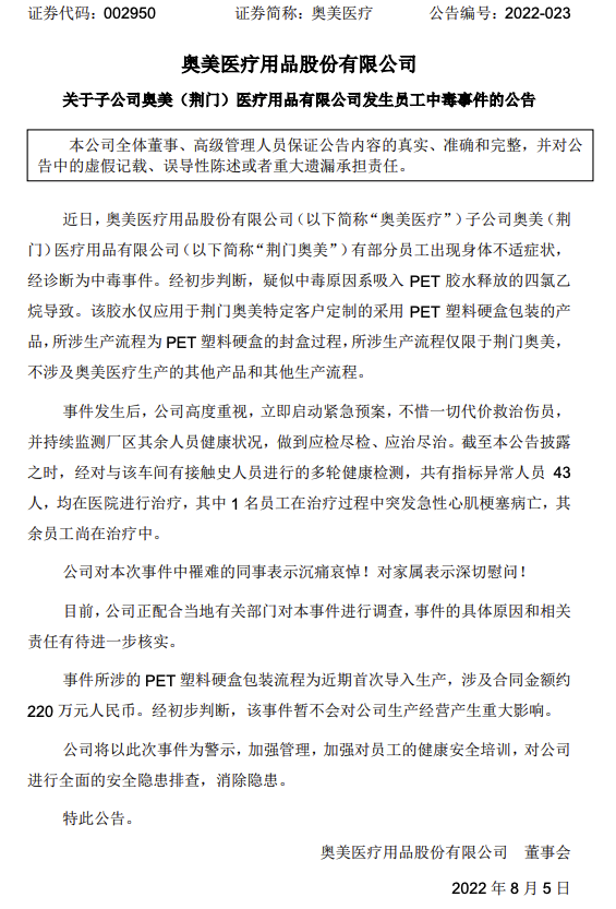 奥美医疗8月5日早间公告,近日,公司子公司奥美(荆门)医疗用品有限公司(以下简称“荆门奥美”)有部分员工出现身体不适症状,经诊断为中毒事件。经初步判断,疑似中毒原因系吸入PET胶水释放的四氯乙烷导致。该胶水仅应用于荆门奥美特定客户定制的采用PET塑料硬盒包装的产品,所涉生产流程为PET塑料硬盒的封盒过程,所涉生产流程仅限于荆门奥美,不涉及奥美医疗生产的其他产品和其他生产流程。