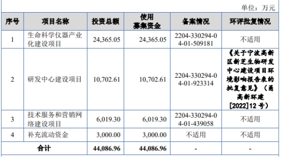 新芝生物拟募集资金44,086.96万元,分别用于生命科学仪器产业化建设项目、研发中心建设项目、技术服务和营销网络建设项目、补充流动资金。