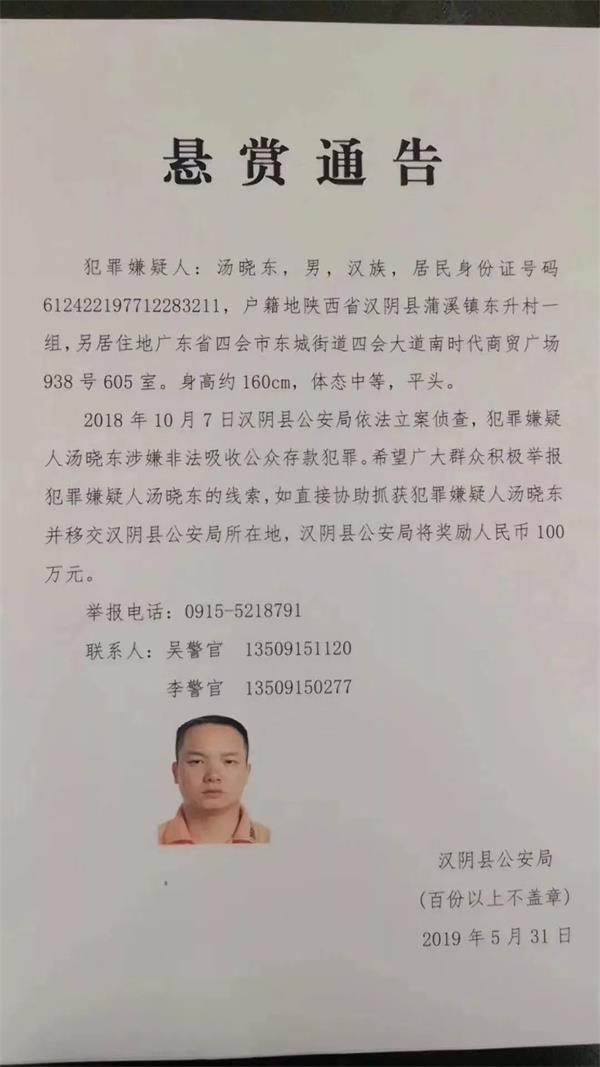 根据悬赏通告,嫌疑人汤晓东涉嫌非法吸收公众存款犯罪,直接协助控制汤晓东并移交汉阴警方所在地,奖励100万元。