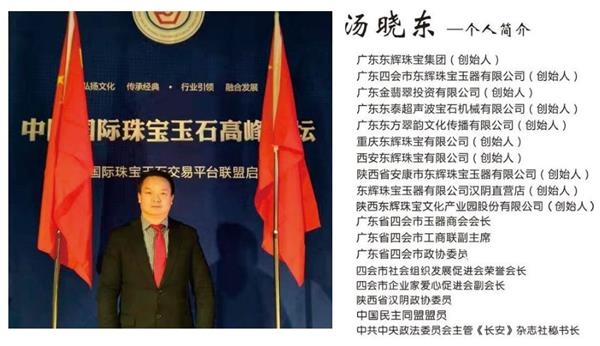 汤晓东是广东东辉珠宝集团的创始人,从事珠宝行业20多年,曾有多个社会任职,包括广东四会市玉器商会会长等。