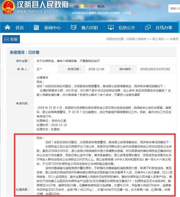 据汉阴县政府官网,今年1月9日,汉阴县政府办就东辉珠宝事宜回复网友来信称,2018年10月4日起,汉阴县公安局陆续接到本县大规模群众报案,称汉阴县城关镇东辉珠宝玉器店向社会公众进行非法集资,目前已停止返本付息,请求受案查处。县公安局受理初查后,发现该珠宝店面向社会不特定人群非法吸收公众存款达100万元以上。汉阴县公安局根据《中华人民共和国刑法》第一百七十六条之规定,于10月7日对东辉珠宝公司非法吸收公众存款案立案侦查。