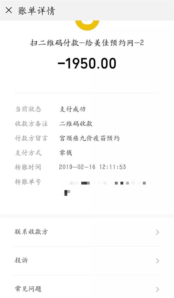 前述张女士表示,其通过中介预约的HPV九价疫苗三针服务没有任何收费凭据,如今打不到疫苗,也没收到任何退款。“没有5300港币的疫苗费用收据,就连之前给黑中介的1950元中介费都没有凭证,只有转账记录。最让我气愤的是这1950元也还未退款。之前五月出问题环亚说七月再开放打针,明显是缓兵之计。现在想起来,中介和香港的一些医疗机构相互串通也不是没可能。”