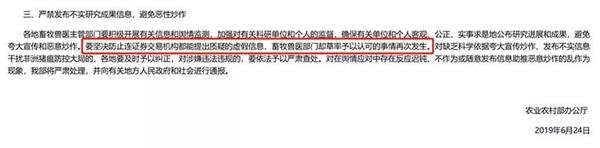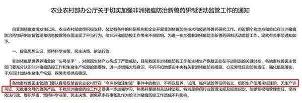 农业农村部表示,自非洲猪瘟疫情发生以来,农业农村部始终积极支持、鼓励有条件的科研机构和企业开展非洲猪瘟防控技术和疫苗等兽药研究工作。但近期个别地方和单位在非洲猪瘟防治药物研制监督管理和信息披露等方面出现了不当行为,给非洲猪瘟防控工作带来不良影响。