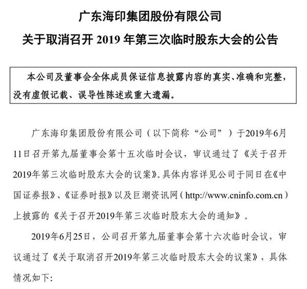 在该公告中,海印股份并未对股东大会取消的原因过多解释,仅表示为“经综合考虑各方因素”。
