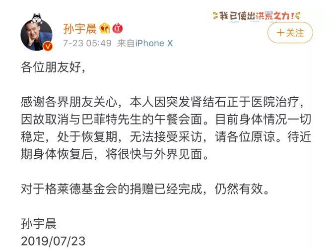 孙宇晨取消与巴菲特午餐的原因是突发肾结石。他在微博中特别强调,“目前身体情况一切稳定,处于恢复期,无法接受采访,请各位原谅。待近期身体恢复后,将很快与外界见面。”