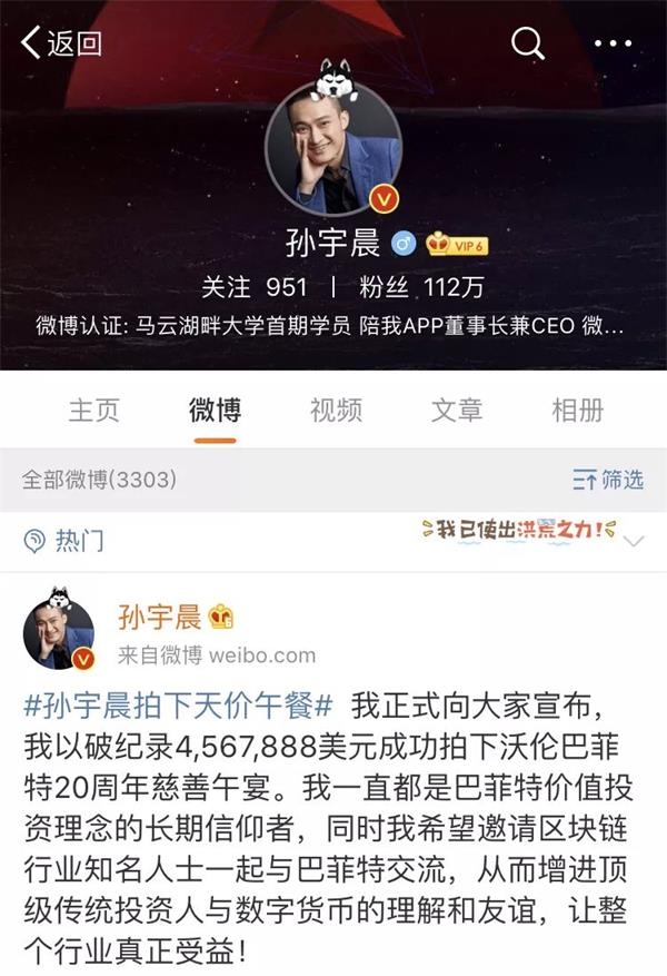 6月4日,孙宇晨宣布,以破纪录的456.7888万美元(约合人民币3153万元)的竞拍价格,拍下了第20届巴菲特慈善午餐。巴菲特一年一度的午餐拍卖所得款项将捐赠给格莱德基金会(GLIDE)。
