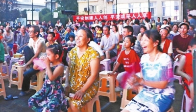 21日晚,纳凉文艺汇演精彩节目引得现场居民开怀大笑 记者金振强 实习生刘奇 肖茹冰 通讯员吴旭 摄