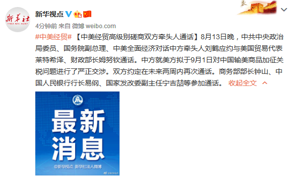 8月13日晚,中共中央政治局委员、国务院副总理、中美全面经济对话中方牵头人刘鹤应约与美国贸易代表莱特希泽、财政部长姆努钦通话。中方就美方拟于9月1日对中国输美商品加征关税问题进行了严正交涉。双方约定在未来两周内再次通话。商务部部长钟山、中国人民银行行长易纲、国家发改委副主任宁吉喆等参加通话。