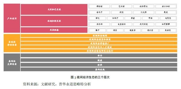夜间经济的打造需要进行系统性考量,从夜间经济的实际功能出发,从业态和内容的差异化设计,持续的运营推广及所必需的基础支撑方面进行着力,夜间经济参与方,应综合考量各个要素,开展与扩大夜间经济经营(图 3)。