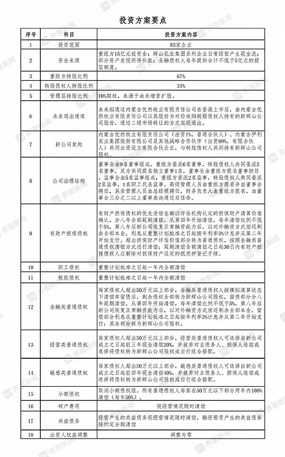 8月12日,界面新闻获得的上述投资要点便是最新的重组方案内容,在辉山乳业大厦,一名管理人成员也向界面新闻确认了伊利该项投资方案,并强调“目前基本确定了是伊利,只是部分债权人不认同还款细则,方案可能还需要伊利和债券委员会磋商”。