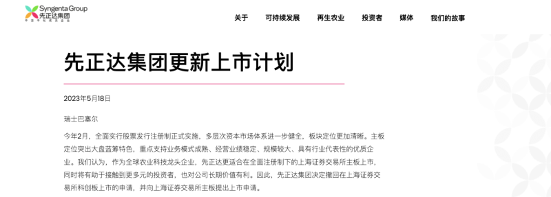 公司在官网表示,全面实行股票发行注册制正式实施后,板块定位更加清晰,主板定位突出大盘蓝筹特色,先正达更适合在全面注册制下的上海证券交易所主板上市,同时将有助于接触到更多元的投资者,也对公司长期价值有利。