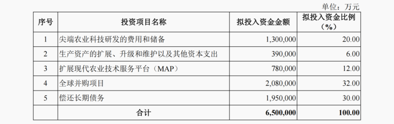从当时的募资投向来看,先正达最主要的募资用途是“全球并购项目”,拟将投入208亿元,另外还将195亿元用于偿还长期债务以及130亿元用于“尖端农业科技研发的费用和储备”。