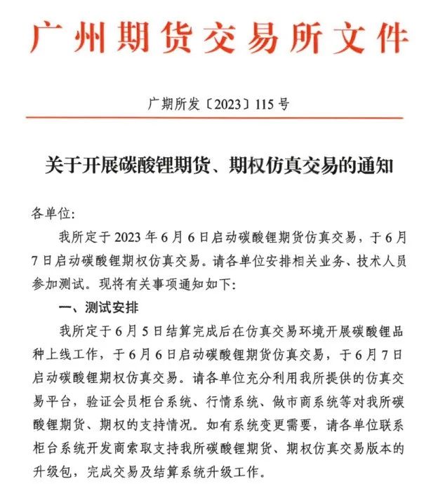 近日,多家期货公司收到了广期所《关于开展碳酸锂期货、期权仿真交易的通知》。《通知》显示,广期所定于6月6日启动碳酸锂期货仿真交易,于6月7日启动碳酸锂期权仿真交易。