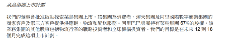 如今,菜鸟已经被确认为阿里计划上市的三大子集团之一。按照计划,菜鸟集团上市计划已经启动,预计在未来12到18个月内完成。目前,阿里巴巴集团持有菜鸟集团 67%的股权。
